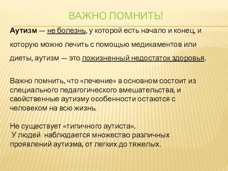 Слайд 7Аутизм — не болезнь, у которой есть начало и конец, и