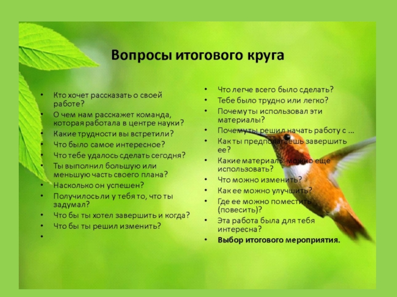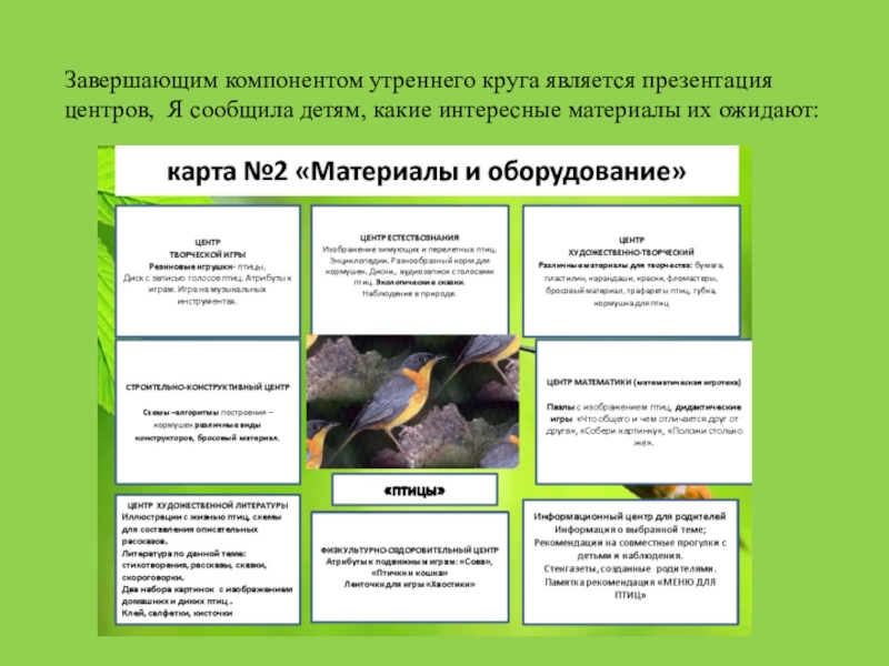 Слайд 10Завершающим компонентом утреннего круга является презентация центров, Я сообщила детям, какие