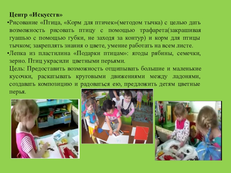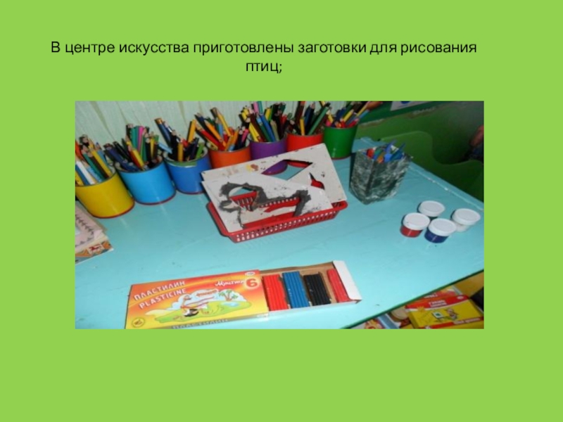 Слайд 11В центре искусства приготовлены заготовки для рисования птиц;