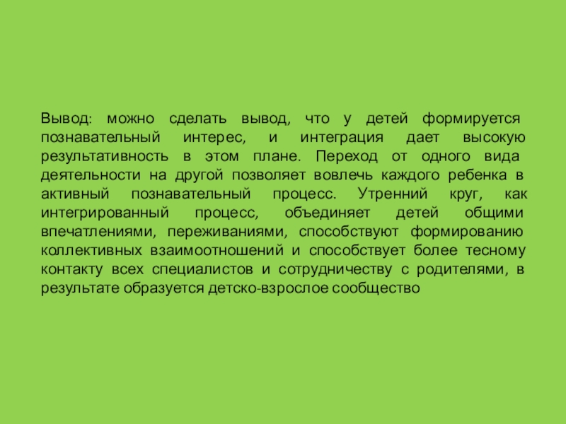 интеграция дает высокую результативность в этом плане. Переход от одного вида деятельности на другой позволяет вовлечь каждого ребенка в активный познавательный процесс. Утренний круг, как интегрированный процесс, объединяет детей общими впечатлениями, переживаниями, способствуют формированию коллективных взаимоотношений и способствует более тесному контакту всех специалистов и сотрудничеству с родителями, в результате образуется детско-взрослое сообщество