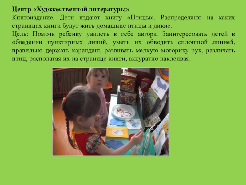 Цель: Помочь ребенку увидеть в себе автора. Заинтересовать детей в обведении пунктирных линий, уметь их обводить сплошной линией, правильно держать карандаш, развивать мелкую моторику рук, различать птиц, располагая их на странице книги, аккуратно наклеивая.