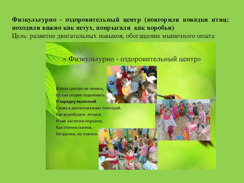 Слайд 20Физкультурно - оздоровительный центр (повторили повадки птиц: походили важно как петух,