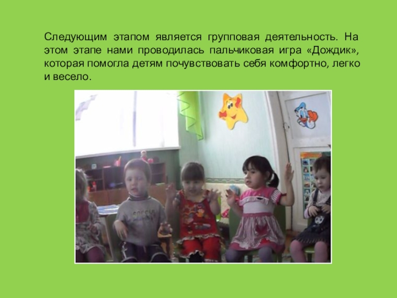 Слайд 6Следующим этапом является групповая деятельность. На этом этапе нами проводилась пальчиковая