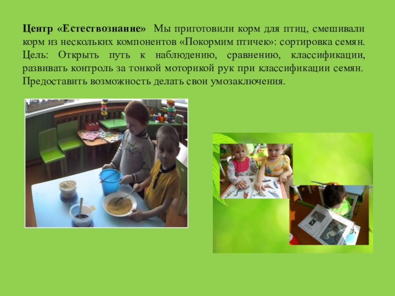 Слайд 16Центр «Естествознание» Мы приготовили корм для птиц, смешивали корм из нескольких