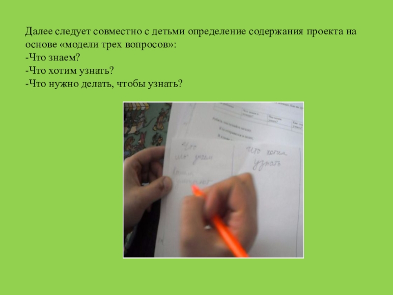 Слайд 8Далее следует совместно с детьми определение содержания проекта на основе «модели