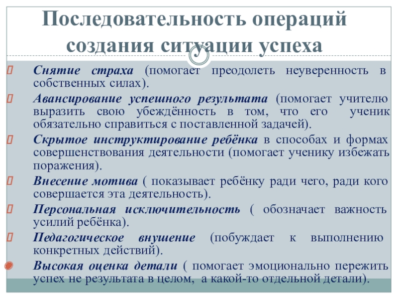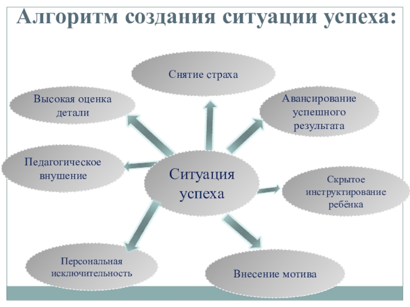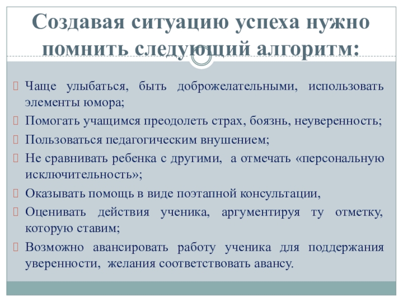 Слайд 6Создавая ситуацию успеха нужно помнить следующий алгоритм: