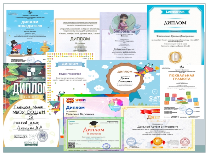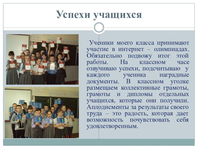 олимпиадах. Обязательно подвожу итог этой работы. На классном часе озвучиваю успехи, подсчитываю у каждого ученика наградные документы. В классном уголке размещаем коллективные грамоты, грамоты и дипломы отдельных учащихся, которые они получили. Аплодисменты за результаты своего труда – это радость, которая дает возможность почувствовать себя удовлетворенным.