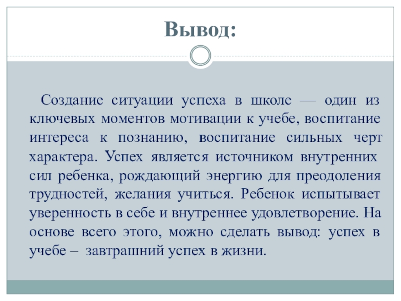 моментов мотивации к учебе, воспитание интереса к познанию, воспитание сильных черт характера. Успех является источником внутренних сил ребенка, рождающий энергию для преодоления трудностей, желания учиться. Ребенок испытывает уверенность в себе и внутреннее удовлетворение. На основе всего этого, можно сделать вывод: успех в учебе – завтрашний успех в жизни.
