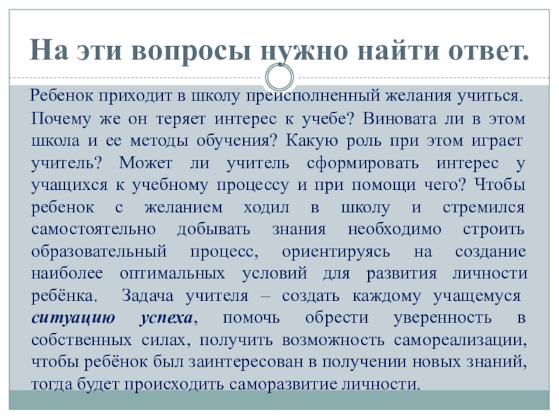 преисполненный желания учиться. Почему же он теряет интерес к учебе? Виновата ли в этом школа и ее методы обучения? Какую роль при этом играет учитель? Может ли учитель сформировать интерес у учащихся к учебному процессу и при помощи чего? Чтобы ребенок с желанием ходил в школу и стремился самостоятельно добывать знания необходимо строить образовательный процесс, ориентируясь на создание наиболее оптимальных условий для развития личности ребёнка. Задача учителя – создать каждому учащемуся ситуацию успеха, помочь обрести уверенность в собственных силах, получить возможность самореализации, чтобы ребёнок был заинтересован в получении новых знаний, тогда будет происходить саморазвитие личности.