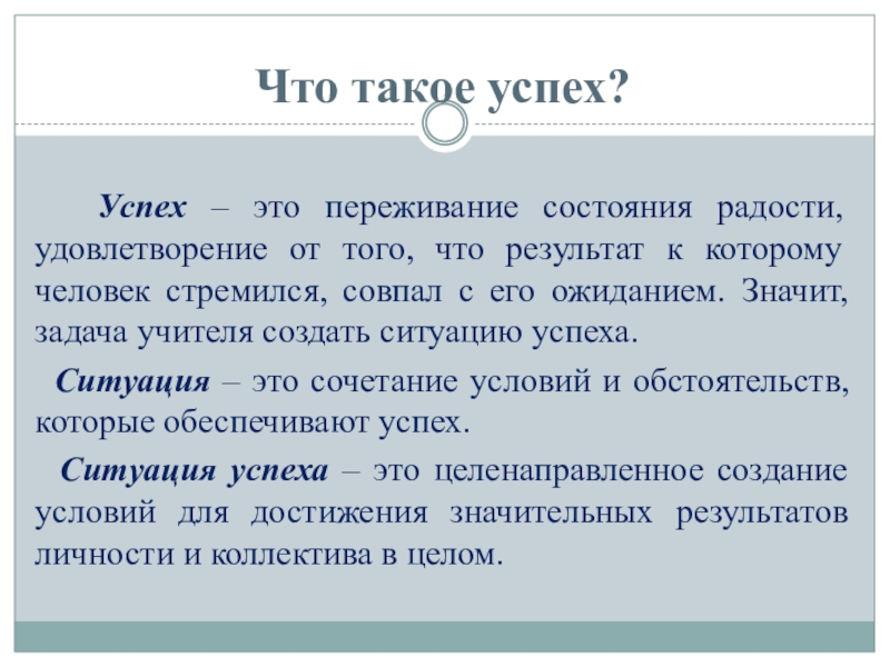 удовлетворение от того, что результат к которому человек стремился, совпал с его ожиданием. Значит, задача учителя создать ситуацию успеха.