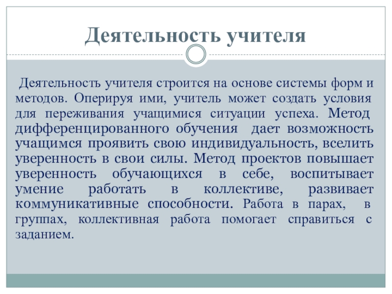 методов. Оперируя ими, учитель может создать условия для переживания учащимися ситуации успеха. Метод дифференцированного обучения дает возможность учащимся проявить свою индивидуальность, вселить уверенность в свои силы. Метод проектов повышает уверенность обучающихся в себе, воспитывает умение работать в коллективе, развивает коммуникативные способности. Работа в парах, в группах, коллективная работа помогает справиться с заданием.