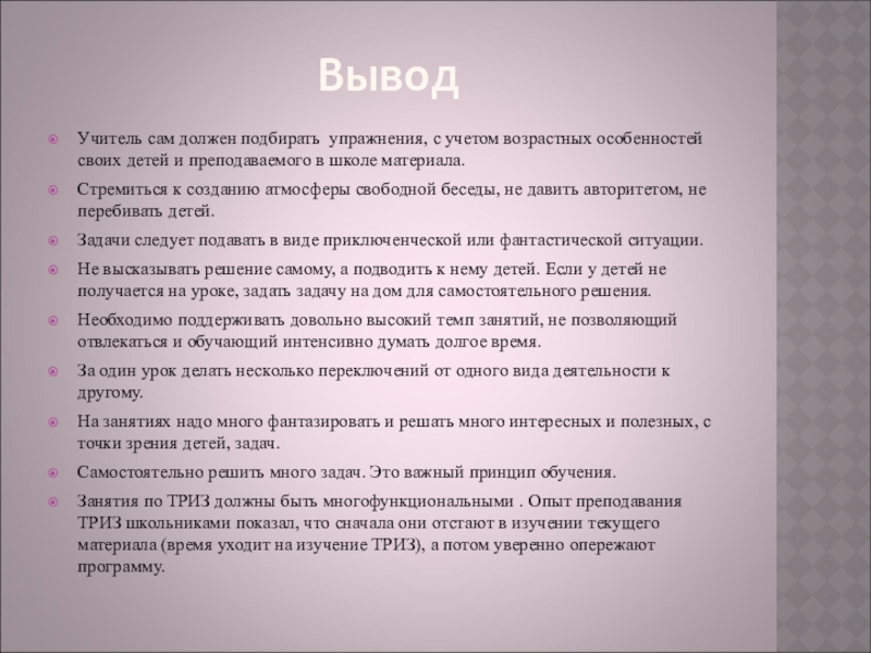 Занятия по ТРИЗ должны быть многофункциональными . Опыт преподавания ТРИЗ школьниками показал, что сначала они отстают в изучении текущего материала (время уходит на изучение ТРИЗ), а потом уверенно опережают программу.