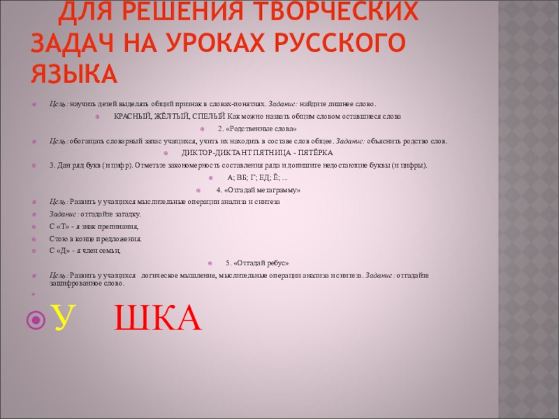 Слайд 12 ДЛЯ РЕШЕНИЯ ТВОРЧЕСКИХ ЗАДАЧ НА УРОКАХ РУССКОГО ЯЗЫКА