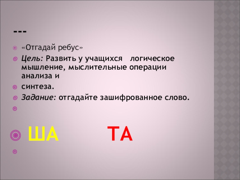 Цель: Развить у учащихся логическое мышление, мыслительные операции анализа и синтеза. Задание: отгадайте зашифрованное слово.