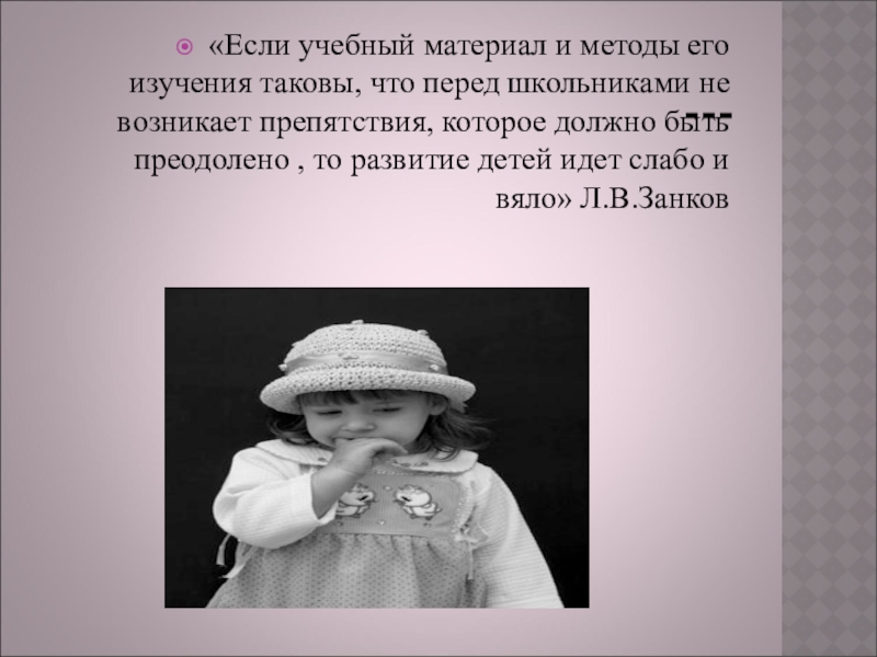 не возникает препятствия, которое должно быть преодолено , то развитие детей идет слабо и вяло» Л.В.Занков