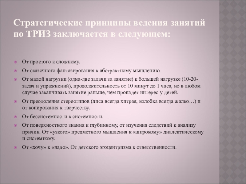 Слайд 10Стратегические принципы ведения занятий по ТРИЗ заключается в следующем:
