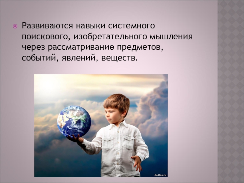 Развиваются навыки системного поискового, изобретательного мышления через рассматривание предметов, событий, явлений,