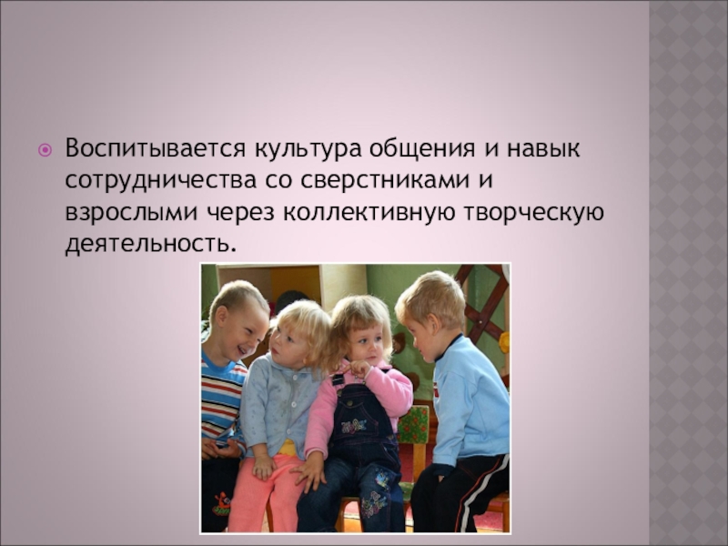 Воспитывается культура общения и навык сотрудничества со сверстниками и взрослыми через