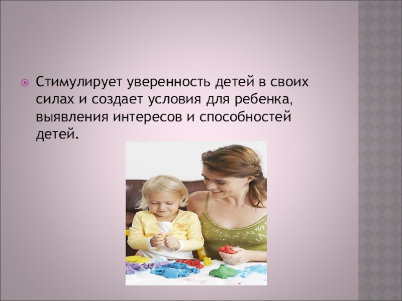 Стимулирует уверенность детей в своих силах и создает условия для ребенка,