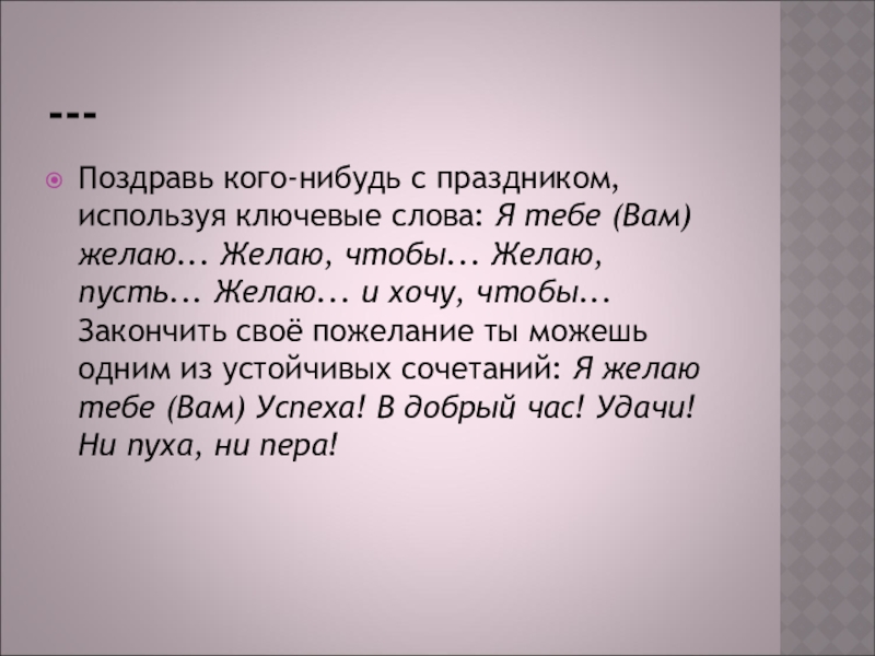 Поздравь кого-нибудь с праздником, используя ключевые слова: Я тебе (Вам) желаю...