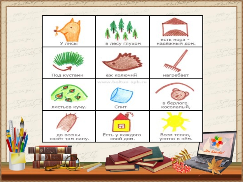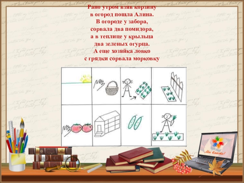 придумывается картинка (изображение); таким образом, все стихотворение зарисовывается схематически. После этого ребенок по памяти, используя графическое изображение, воспроизводит стихотворение целиком.