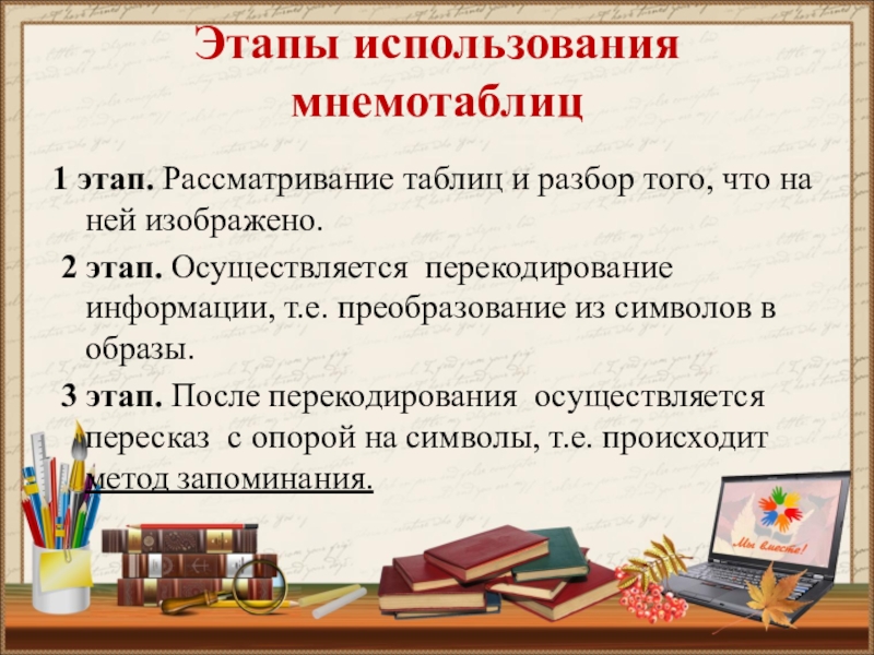 Слайд 6Этапы использования мнемотаблиц