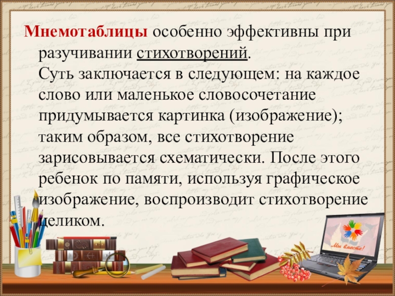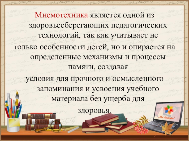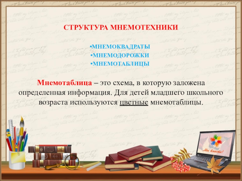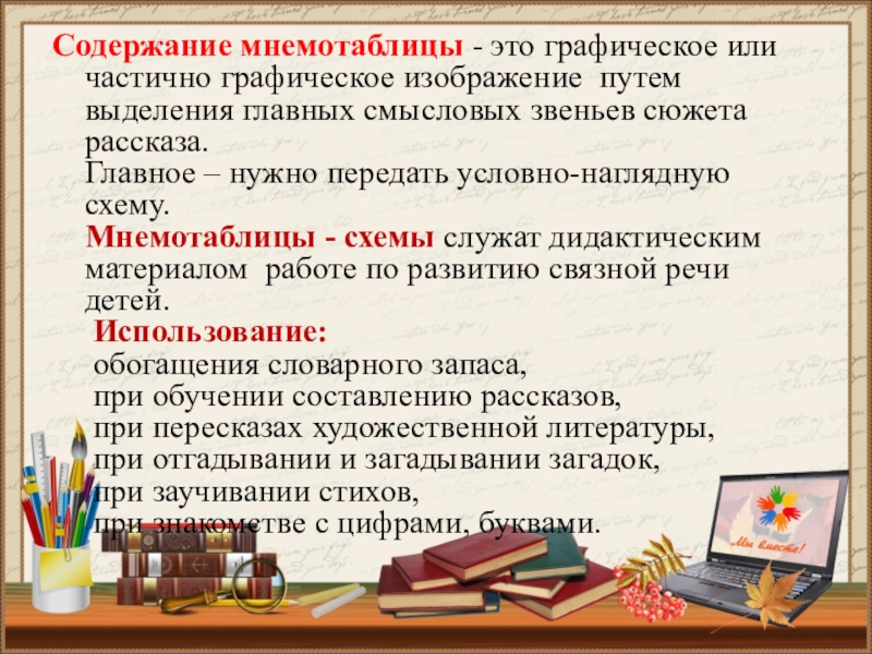 Это технология развития памяти, система методов и приемов, обеспечивающих успешное запоминание, сохранение и воспроизведение информации, знаний об особенностях объектов природы, об окружающем мире, эффективное запоминание структуры рассказа, и, конечно, развитие речи.