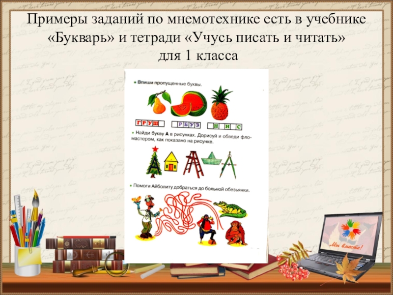 Слайд 9Примеры заданий по мнемотехнике есть в учебнике «Букварь» и тетради «Учусь