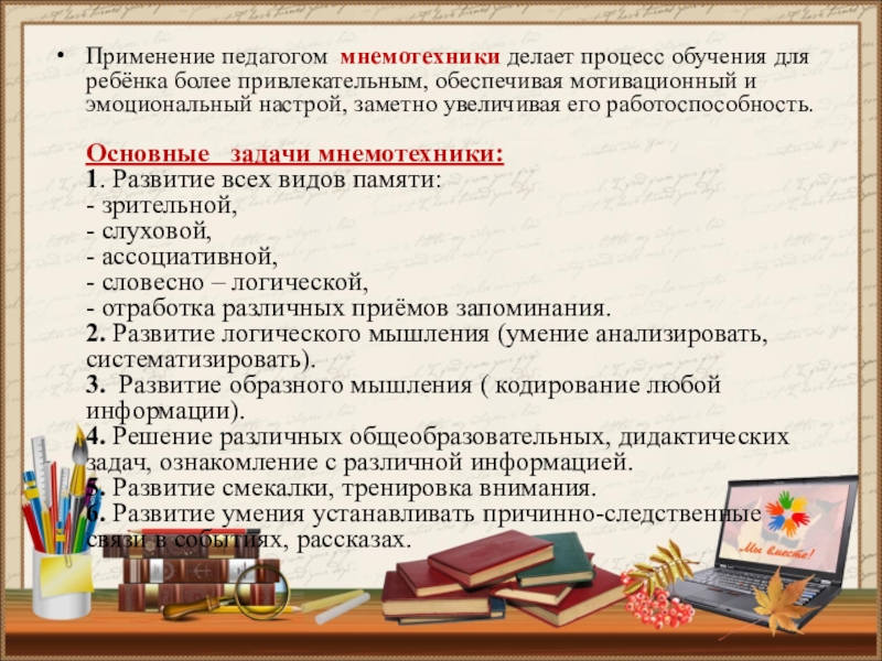 Основные задачи мнемотехники: