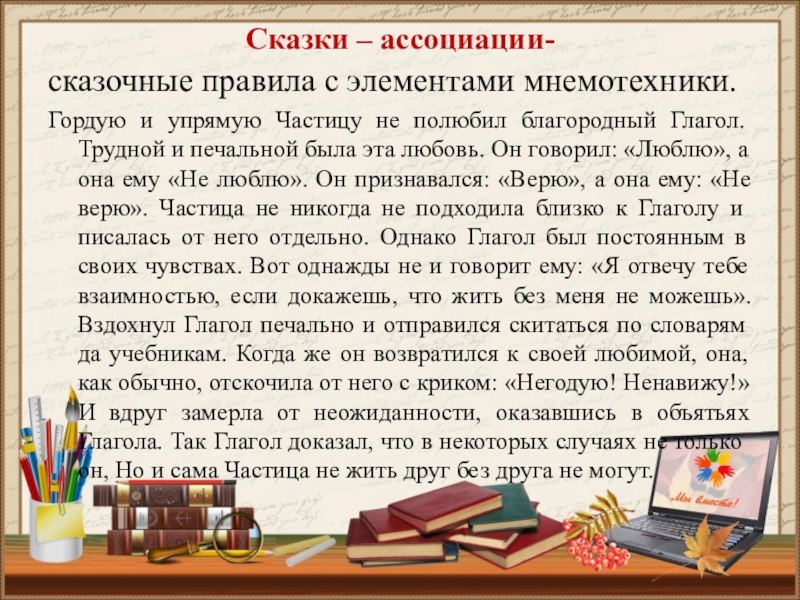 полюбил благородный Глагол. Трудной и печальной была эта любовь. Он говорил: «Люблю», а она ему «Не люблю». Он признавался: «Верю», а она ему: «Не верю». Частица не никогда не подходила близко к Глаголу и писалась от него отдельно. Однако Глагол был постоянным в своих чувствах. Вот однажды не и говорит ему: «Я отвечу тебе взаимностью, если докажешь, что жить без меня не можешь». Вздохнул Глагол печально и отправился скитаться по словарям да учебникам. Когда же он возвратился к своей любимой, она, как обычно, отскочила от него с криком: «Негодую! Ненавижу!» И вдруг замерла от неожиданности, оказавшись в объятьях Глагола. Так Глагол доказал, что в некоторых случаях не только он, Но и сама Частица не жить друг без друга не могут.