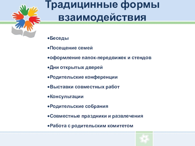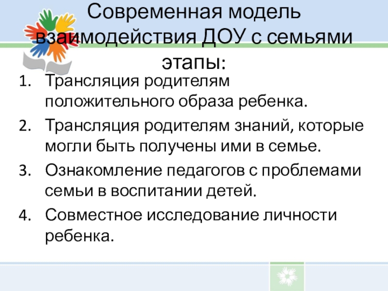 работа с коллективом ДОУ по организации взаимодействия с семьей, ознакомление педагогов с системой новых форм работы с родителями.