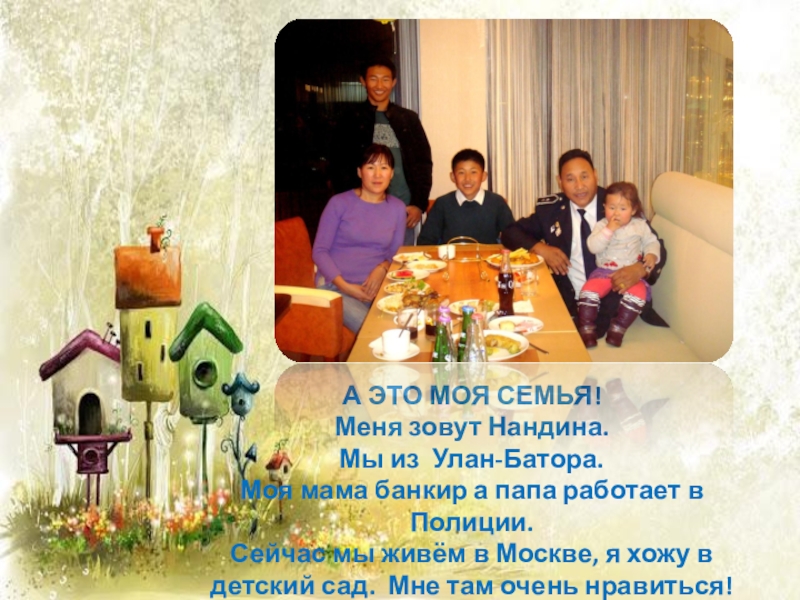 А ЭТО МОЯ СЕМЬЯ!Меня зовут Нандина. Мы из Улан-Батора. Моя мама банкир а папа работает в Полиции.