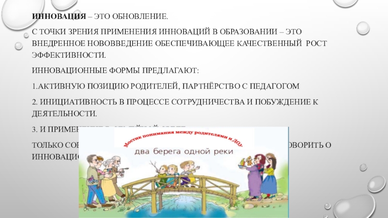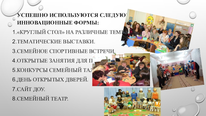 ИННОВАЦИОННЫЕ ФОРМЫ ДЕЛАЮТ РОДИТЕЛЕЙ АКТИВНЫМИ УЧАСТНИКАМИ В ЖИЗНИ ГРУППЫ И ДЕТСКОГО САДА, РОДИТЕЛИ ВЫСТУПАЮТ В РОЛЕ РАВНОПРАВНЫХ ПАРТНЕРОВ ПЕДАГОГОВ ПРОЯВЛЯЮТ ИНИЦИАТИВУ.