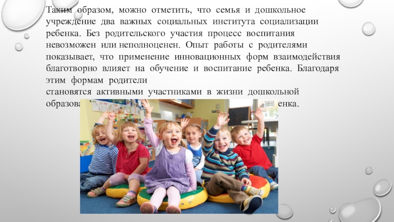 социальных института социализации ребенка. Без родительского участия процесс воспитания невозможен или неполноценен. Опыт работы с родителями показывает, что применение инновационных форм взаимодействия благотворно влияет на обучение и воспитание ребенка. Благодаря этим формам родители