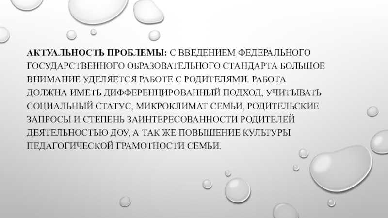 РАБОТЕ С РОДИТЕЛЯМИ. РАБОТА ДОЛЖНА ИМЕТЬ ДИФФЕРЕНЦИРОВАННЫЙ ПОДХОД, УЧИТЫВАТЬ СОЦИАЛЬНЫЙ СТАТУС, МИКРОКЛИМАТ СЕМЬИ, РОДИТЕЛЬСКИЕ ЗАПРОСЫ И СТЕПЕНЬ ЗАИНТЕРЕСОВАННОСТИ РОДИТЕЛЕЙ ДЕЯТЕЛЬНОСТЬЮ ДОУ, А ТАК ЖЕ ПОВЫШЕНИЕ КУЛЬТУРЫ ПЕДАГОГИЧЕСКОЙ ГРАМОТНОСТИ СЕМЬИ.