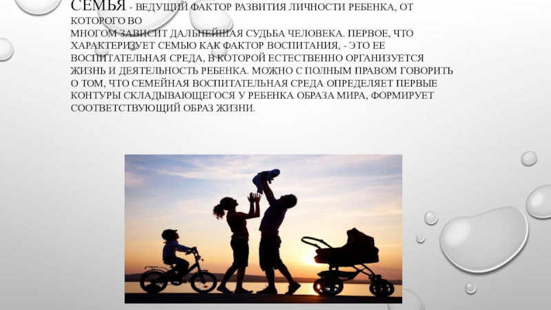 ДАЛЬНЕЙШАЯ СУДЬБА ЧЕЛОВЕКА. ПЕРВОЕ, ЧТО ХАРАКТЕРИЗУЕТ СЕМЬЮ КАК ФАКТОР ВОСПИТАНИЯ, - ЭТО ЕЕ ВОСПИТАТЕЛЬНАЯ СРЕДА, В КОТОРОЙ ЕСТЕСТВЕННО ОРГАНИЗУЕТСЯ ЖИЗНЬ И ДЕЯТЕЛЬНОСТЬ РЕБЕНКА. МОЖНО С ПОЛНЫМ ПРАВОМ ГОВОРИТЬ О ТОМ, ЧТО СЕМЕЙНАЯ ВОСПИТАТЕЛЬНАЯ СРЕДА ОПРЕДЕЛЯЕТ ПЕРВЫЕ КОНТУРЫ СКЛАДЫВАЮЩЕГОСЯ У РЕБЕНКА ОБРАЗА МИРА, ФОРМИРУЕТ СООТВЕТСТВУЮЩИЙ ОБРАЗ ЖИЗНИ.