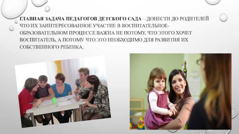 Слайд 13ГЛАВНАЯ ЗАДАЧА ПЕДАГОГОВ ДЕТСКОГО САДА – ДОНЕСТИ ДО РОДИТЕЛЕЙ ЧТО ИХ