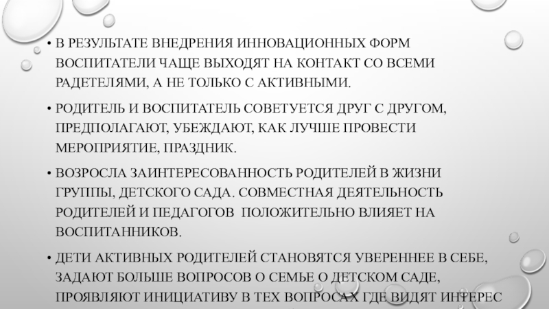 Слайд 12В РЕЗУЛЬТАТЕ ВНЕДРЕНИЯ ИННОВАЦИОННЫХ ФОРМ ВОСПИТАТЕЛИ ЧАЩЕ ВЫХОДЯТ НА КОНТАКТ СО