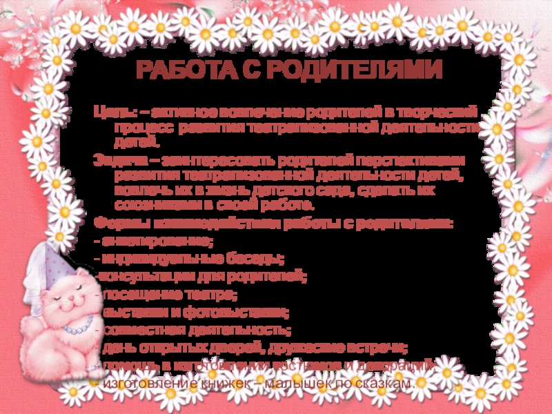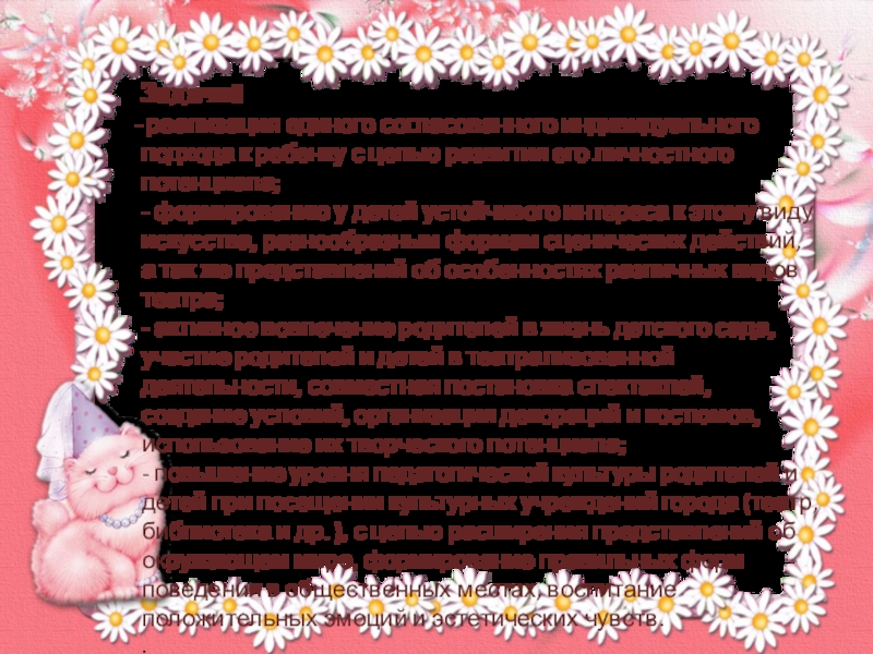 Задача – заинтересовать родителей перспективами развития театрализованной деятельности детей, вовлечь их в жизнь детского сада, сделать их союзниками в своей работе.