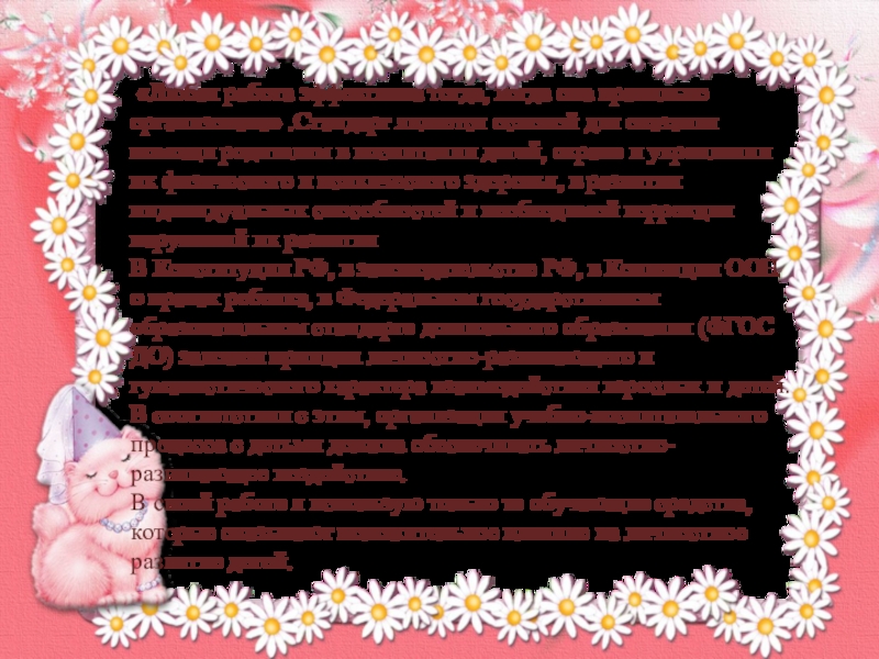 В Конституции РФ, в законодательстве РФ, в Конвенции ООН о правах ребенка, в Федеральном государственном образовательном стандарте дошкольного образования (ФГОС ДО) заложен принцип личностно-развивающего и гуманистического характера взаимодействия взрослых и детей. В соответствии с этим, организация учебно-воспитательного процесса с детьми должна обеспечивать личностно-развивающее воздействие.