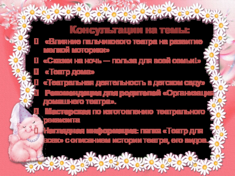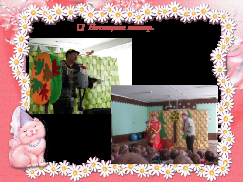 Приобщение детей к театральной культуре (знакомство с устройством театра, театральными жанрами, с разными видами кукольных театров) и вовлечение в эту деятельность родителей.