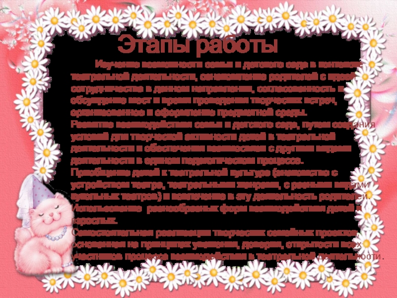 сада в контексте театральной деятельности, ознакомление родителей с идеей сотрудничества в данном направлении, согласованность и обсуждение мест и время проведения творческих встреч, организованное и оформление предметной среды.
