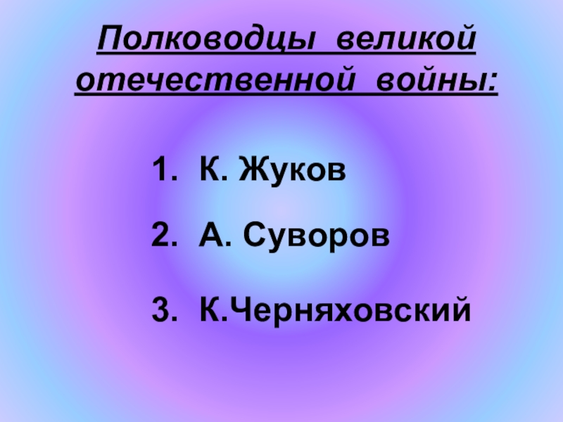Полководцы великой отечественной войны:3. К.Черняховский2. А. Суворов1. К. Жуков