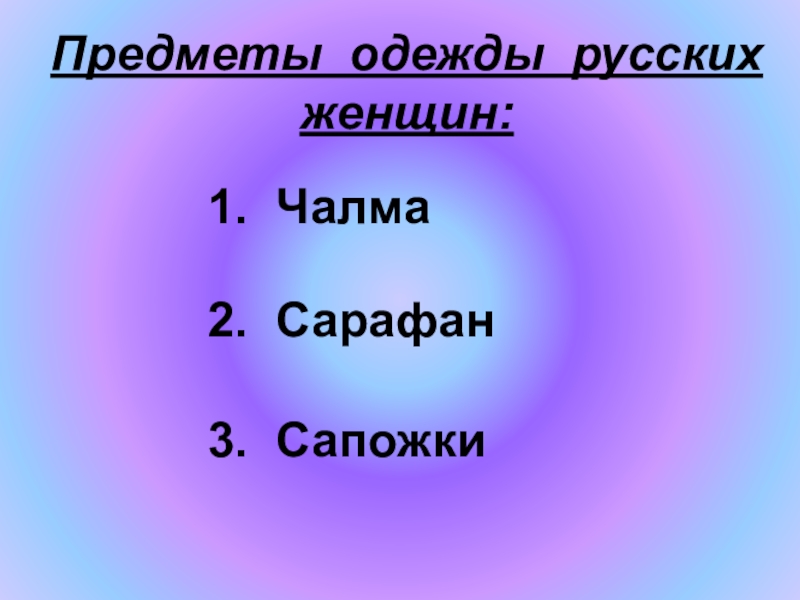 Предметы одежды русских женщин:3. Сапожки2. Сарафан1. Чалма