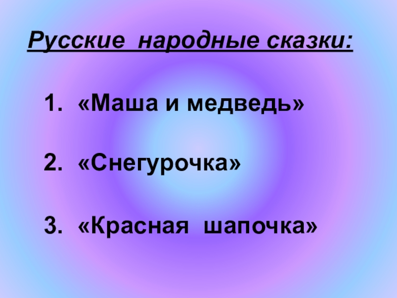 1. «Маша и медведь»2. «Снегурочка»3. «Красная шапочка»Русские народные сказки: