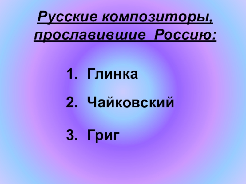 Русские композиторы, прославившие Россию:3. Григ2. Чайковский1. Глинка