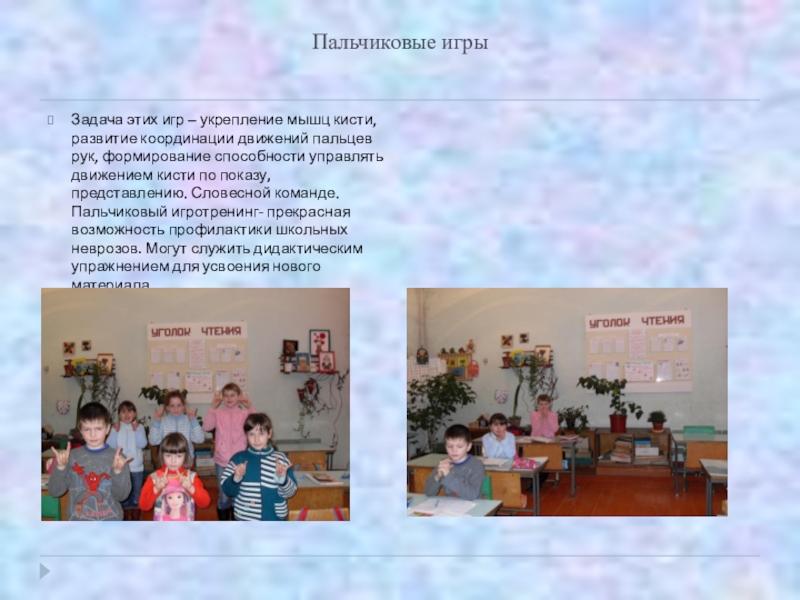 пальцев рук, формирование способности управлять движением кисти по показу, представлению. Словесной команде. Пальчиковый игротренинг- прекрасная возможность профилактики школьных неврозов. Могут служить дидактическим упражнением для усвоения нового материала.