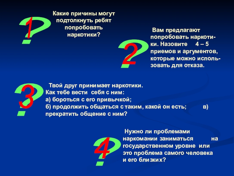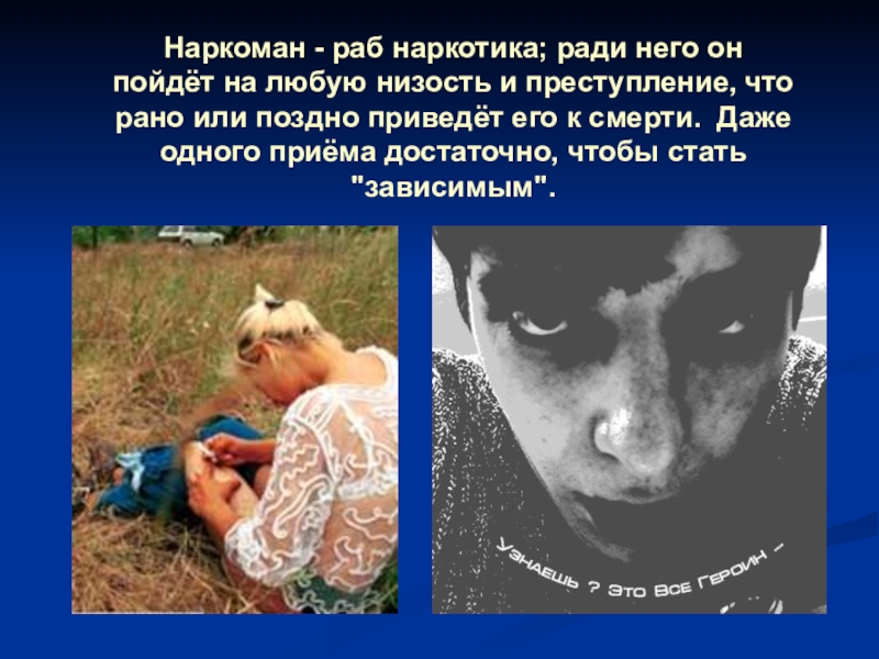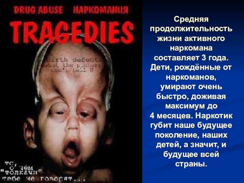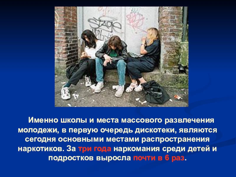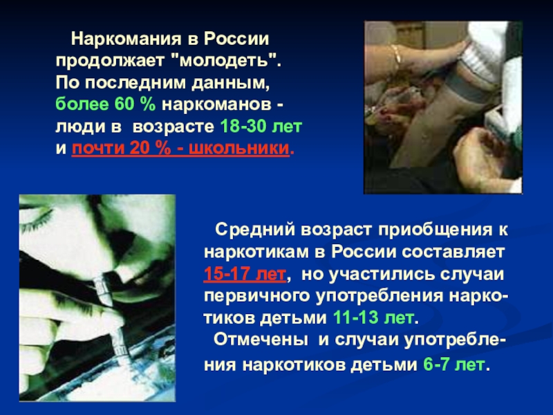 Наркомания в России продолжает "молодеть". По последним данным, более 60 % наркоманов - люди в возрасте 18-30 лет и почти 20 % - школьники.