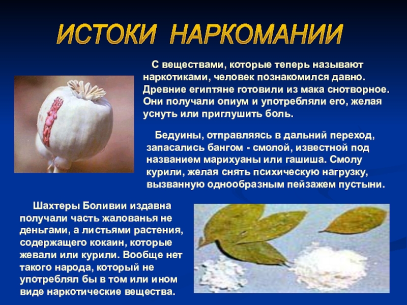 С веществами, которые теперь называют наркотиками, человек познакомился давно. Древние египтяне готовили из мака снотворное. Они получали опиум и употребляли его, желая уснуть или приглушить боль.