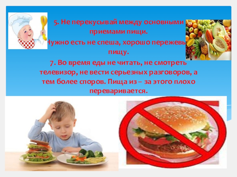 7. Во время еды не читать, не смотреть телевизор, не вести серьезных разговоров, а тем более споров. Пища из – за этого плохо переваривается.